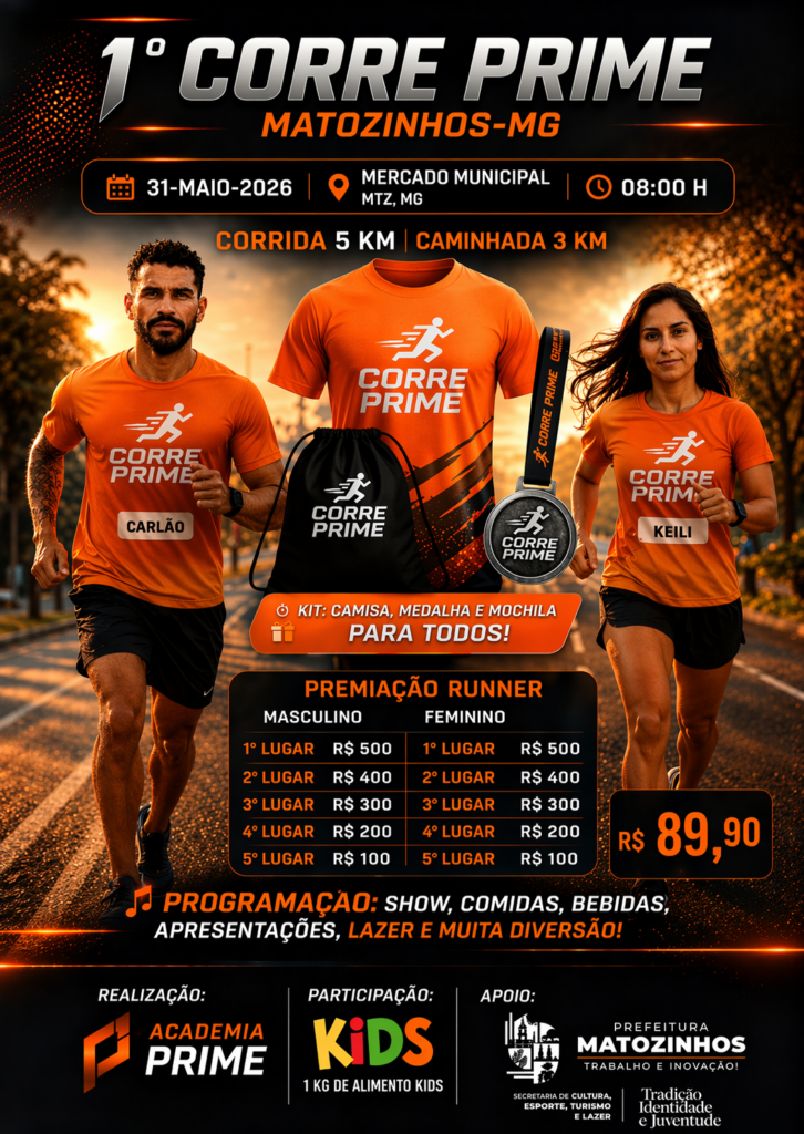 Foi dada a largada para um dos eventos esportivos mais aguardados do ano em Matozinhos. A Academia Prime promove, no dia 31 de maio de 2026, a 1ª Corrida Prime Matozinhos, reunindo esporte, lazer e entretenimento em um só lugar.