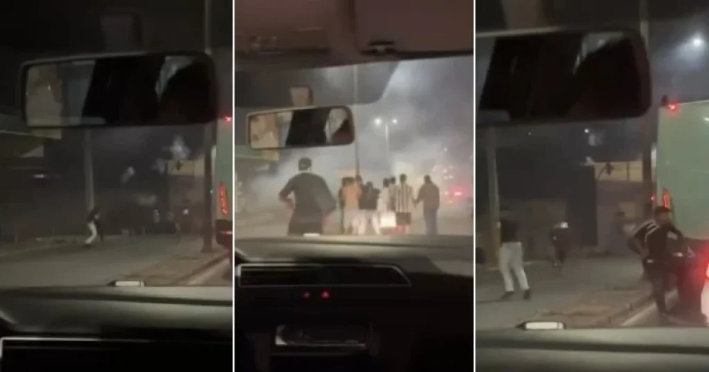Vídeos obtidos pela Itatiaia mostram disparos de rojões na direção dos torcedores, parte da briga e a PM intervindo. Assista: