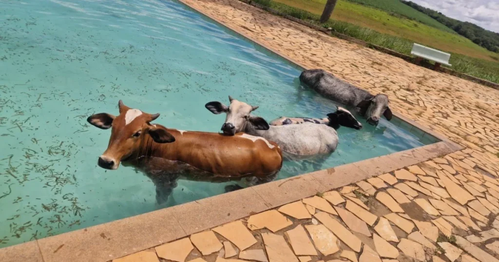 O Corpo de Bombeiros resgatou, na manhã desta sexta-feira (2), quatro vacas que caíram dentro da piscina do Clube Náutico de Alfenas, às margens da Represa de Furnas, na cidade de Alfenas, no Sudeoeste de Minas Gerais. “Até as vacas não aguentaram o calor”, brincou a corporação em nota à imprensa.